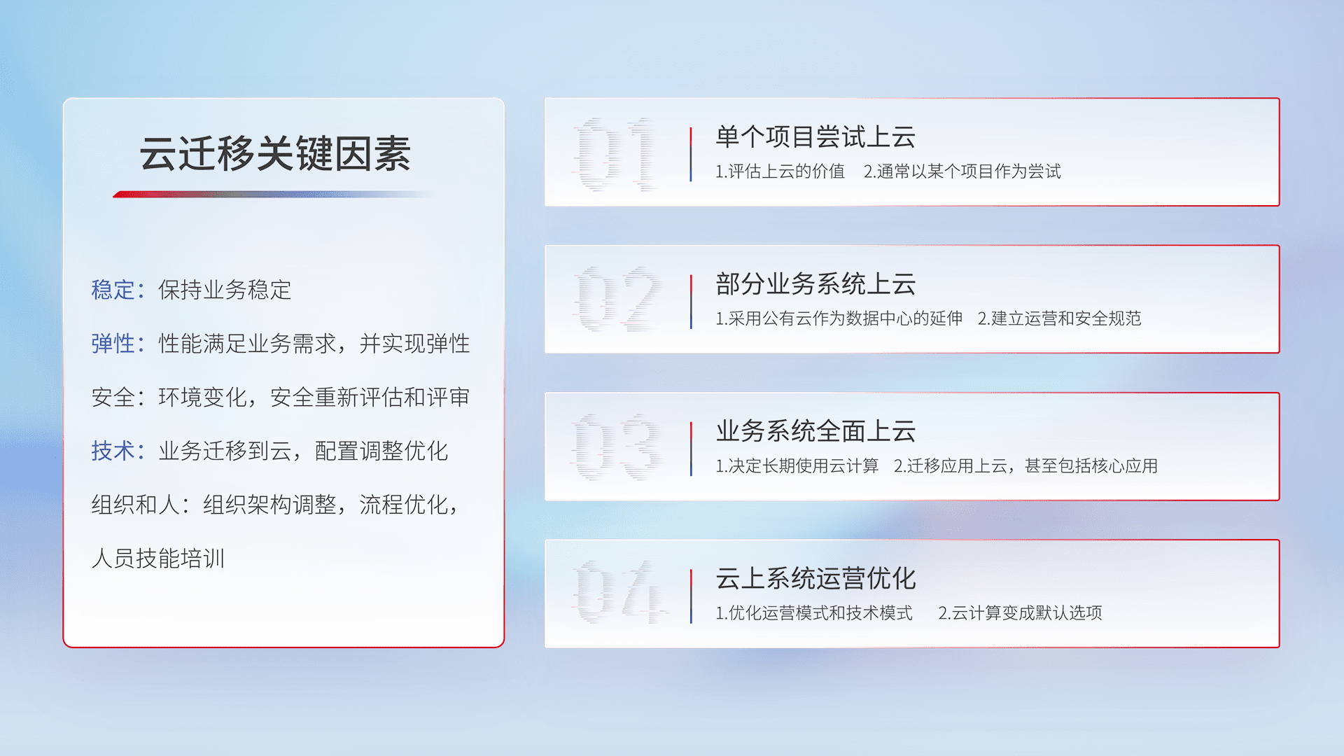 结合实际业务,,,,从规划设计、、、云平台选型、、、、云原生改造、、、、数据迁移、、、集成交付,,,,迁移全过程为客户识别最佳上云路径,,做好风险识别管理,,,设计网络架构、、、身份权限、、、安全审计合规、、、操作审计、、、、日志审计、、、、监控告警策略、、多站点容灾设计等,,,,对云上基础设施进行整体规划,,,提升IT治理水平,,,以满足弹性、、、、高可用、、、高性能的需求。。。
